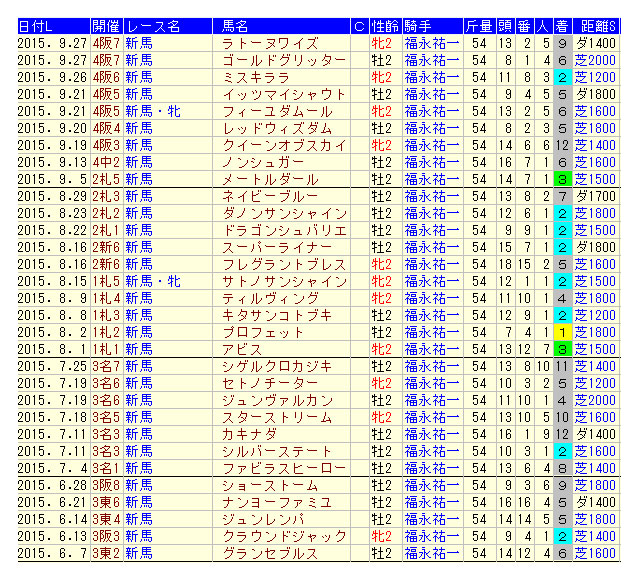 福永騎手が今年行われた新馬戦に騎乗したのは9月27日時点で31回。その成績は【1・8・2・20】の勝率3.2%と散々な結果である。