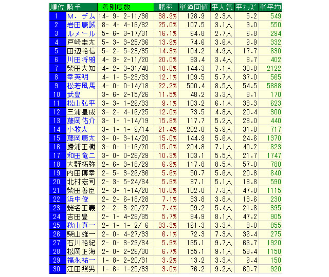 2位の岩田騎手が8勝、勝率25%だけに、いかにデムーロ騎手の数字が突出しているかが分かる。単勝回収率でも2人は100%を超えている。